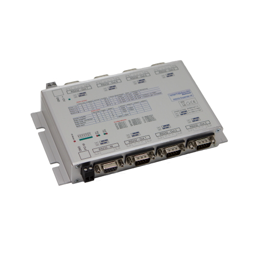 Der RS232-Expander 1-7 IR ist eine Schnittstellenerweiterung mit einem RS232 Mastereingang, sieben RS232 Ausgängen und einem IR-Out. Der Eingang wird mit einer festgelegten Konfiguration (9600 8,N,1) angesprochen, die Ausgänge sind frei und unterschiedlich konfigurierbar. Dadurch kann der Expander gut in Mediensystemen eingesetzt werden, welche eine Baudratenänderung während der Laufzeit des Anwenderprogramms nicht unterstützen. Eine bidirektionale Verwendung ist dank des eingebauten Zeichenbuffers leicht möglich.Zur einfachen Montage besitzt das Gehäuse vier Befestigungslöcher.