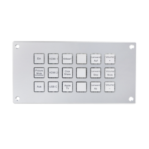 Das Stp 18-ALU/WgP64 ist eine komplette Mediensteuerung mit 18 beleuchteten Tasten. Die Tasten und Led´s sind absolut frei programmierbar. Alle Tasten sind durch Schrifteinlagen einfach beschriftbar. Die Steuerung ist als Aluminium-Einbaublende erhältlich. Durch die freie Programmierung ist ein Einbau in waagerechter oder senkrechter Position möglich. Die Steuerung kann beliebig durch weitere Tastenfelder der Tf-Serie oder durch andere Module mit BUS-Anschluss (z.B. RS232-Schnittstelle, Leinwandmodul LW1, Relcard4 etc.) erweitert werden Die Steuerung kann durch die geringe Bauhöhe perfekt in einen Kabelkanal eingebaut werden und durch Anschlüsse wie HDMI, VGA oder andere Anschlüsse erweitert werden.
